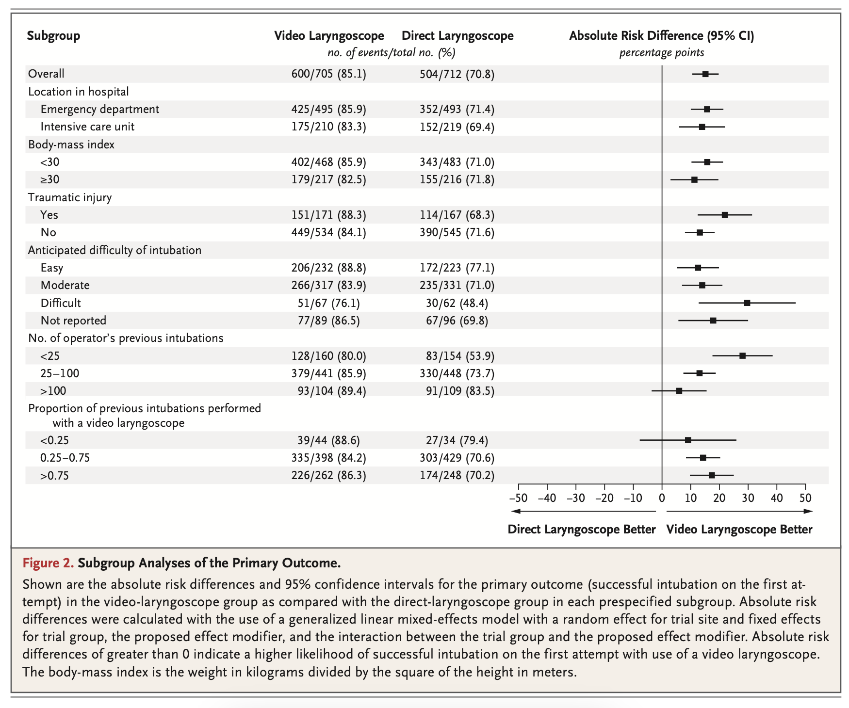 A última atualização da revisão sistemática da Cochrane de 2022 que incluiu 222 estudos (219 ensaios clínicos randomizados (ECRs) e 3 quasi-ensaios) concluiu que o uso da video-laringoscopia (independentemente do dispositivo) provavelmente está associado a taxas menores de falha na intubação e resultam em taxas maiores de sucesso na primeira tentativa quando comparado à laringoscopia direta convencional. A minoria dos estudos incluídos nessa revisão, entretanto, foi realizado na emergência.
