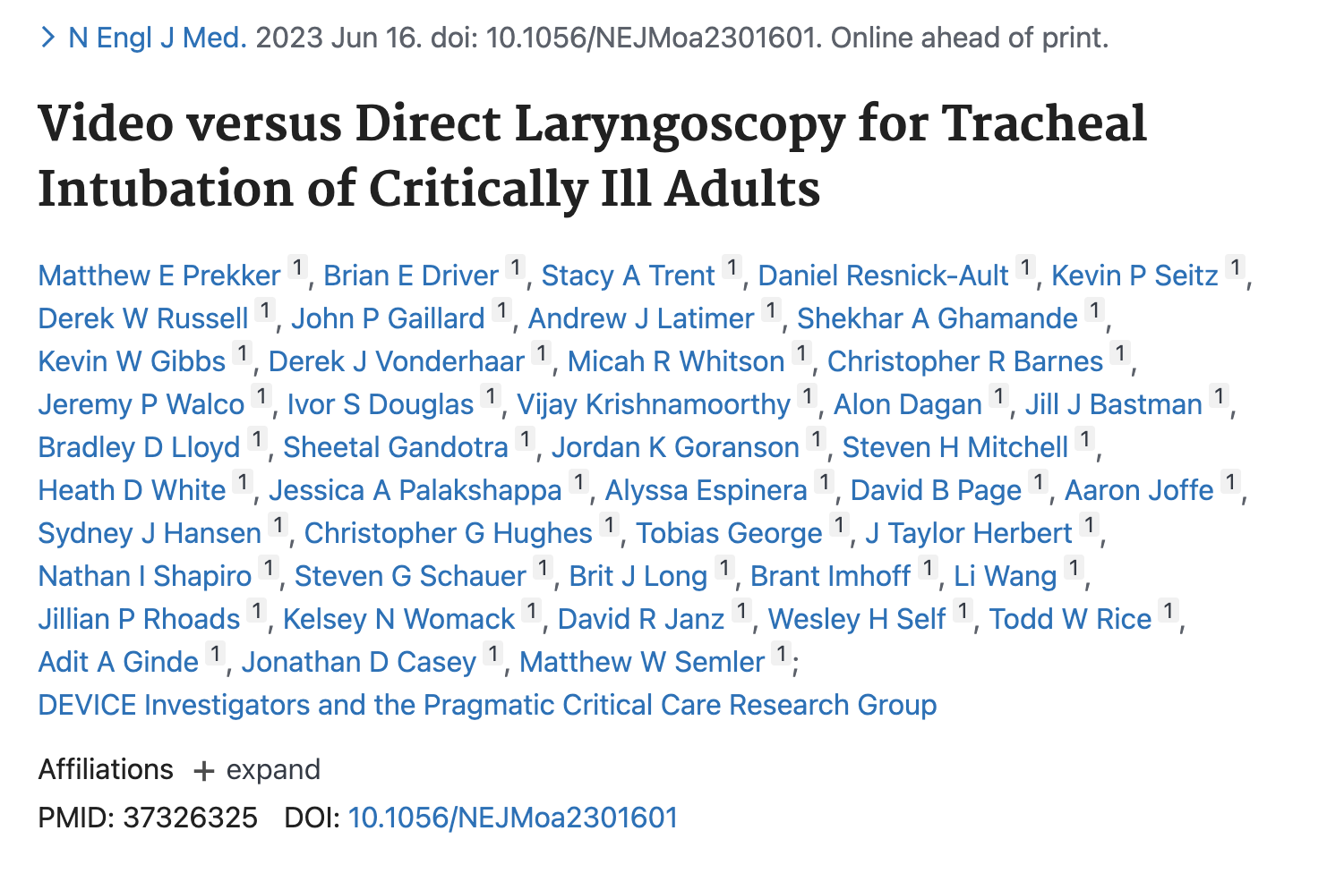 Prekker ME, Driver BE, Trent SA, et al. Video versus Direct Laryngoscopy for Tracheal Intubation of Critically Ill Adults [published online ahead of print, 2023 Jun 16]. N Engl J Med. 2023;10.1056/NEJMoa2301601. doi:10.1056/NEJMoa2301601