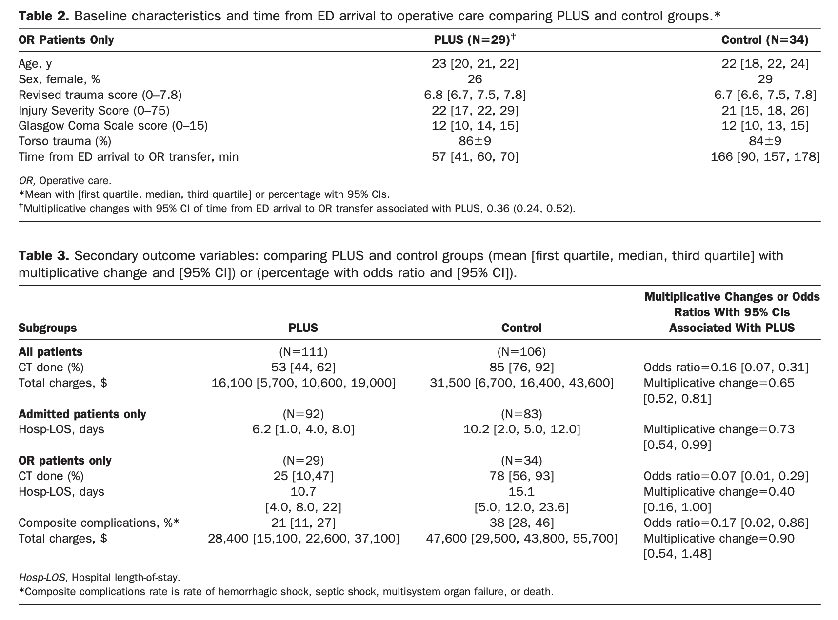 O tempo médio entre a chegada na emergência e a transferência para o bloco cirúrgico foi de 57 minutos no grupo FAST, em comparação com 166 minutos no grupo controle.