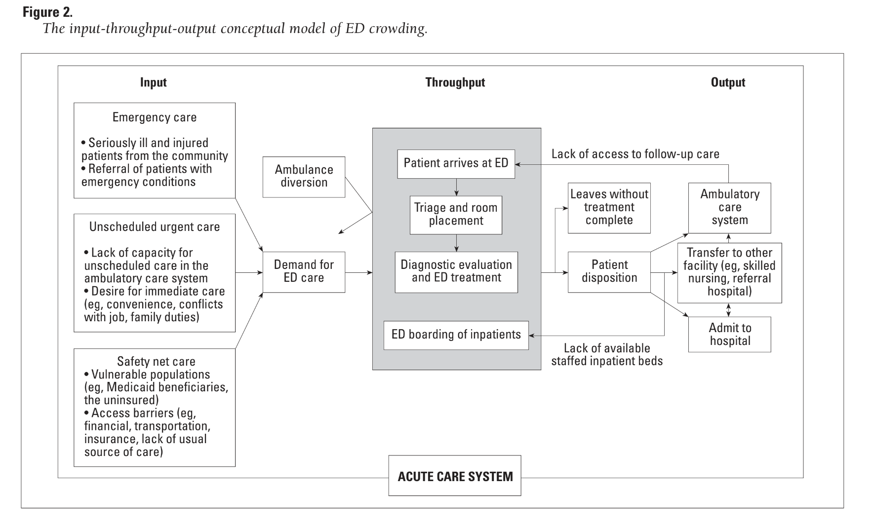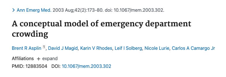 Asplin BR, Magid DJ, Rhodes KV, Solberg LI, Lurie N, Camargo CA Jr. A conceptual model of emergency department crowding. Ann Emerg Med. 2003;42(2):173-180. doi:10.1067/mem.2003.302